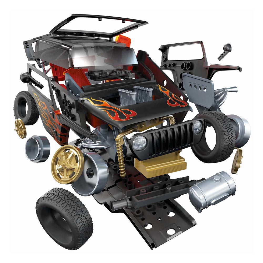 A mix of the iconic Jeep Wrangler with the concept of a hot rod gives you this amazing Jeep Quicksand Concept, created for enthusiasts who love the sand life! The Jeep Quicksand concept features a longer wheelbase than the standard two-door Wrangler. The body has been trimmed in the front and the rear, while the hardtop and the windshield have been chopped giving the Quicksand a longer, faster, and lower appearance. With an open-top and no windows, you are exposed to the elements of the outdoors and can take in the sound and the wind from your journeys. 49 Parts.