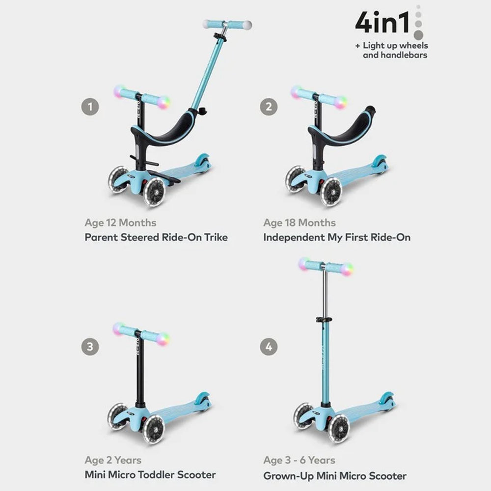 The 4 stages of the Mini 2 Grow are: 1. Parent guided ride on trike for ages 12 months 2. Independent ride on trike for ages 18 months + 3. My first Mini Micro toddler scooter for ages 2 years + 4. Grown Up Mini Micro scooter for ages 3-6