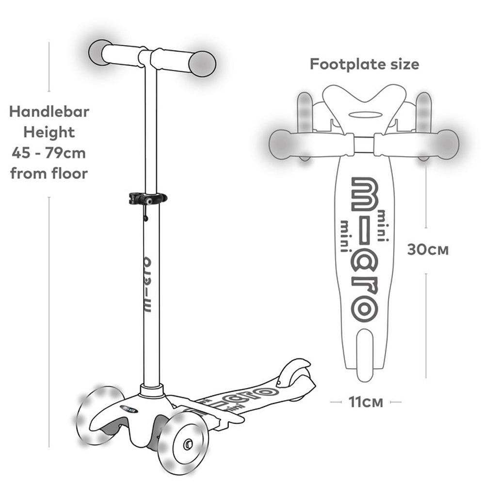 Stage Four – From ages 3 to 6 - Grown Up Mini Micro • The adjustable handlebar will last your child until they are 6 • Light-up adjustable handlebars. Touch-sensitive, shatterproof lights to glow as they go for growing adventurers • Battery-free light-up “Moon” wheels. Touch-sensitive. Bright white LEDs cover the whole wheel. Clever induction technology means kids power the lights as they move. No batteries. No fuss. For thousands of light-up adventures. • Strong, robust rear brake for stopping safely • Reinforced fibreglass footplate – extra strong, extra grippy for total safety • Intuitive lean-to-steer riding style makes learning to scoot quick, easy and fun • No need for a child to balance, scooting helps to improve fine and gross motor skills, coordination and confidence.