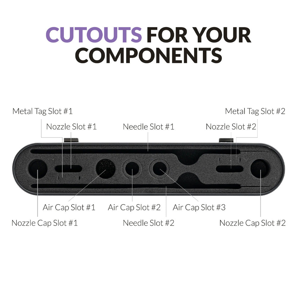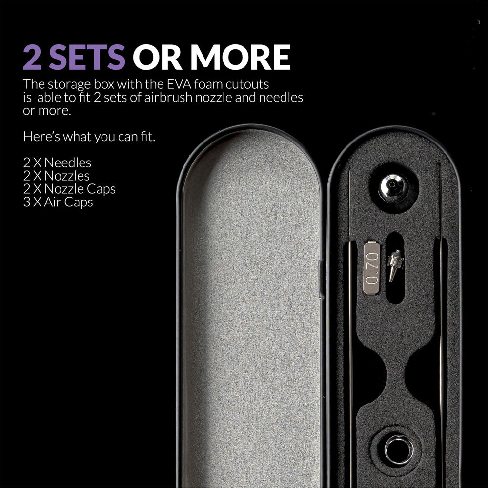 HOLDS 2 SETS OR MORE : With its versatile EVA foam cutouts, this box can accommodate up to two sets of airbrush nozzles, needles, and more. Here’s what it can hold: