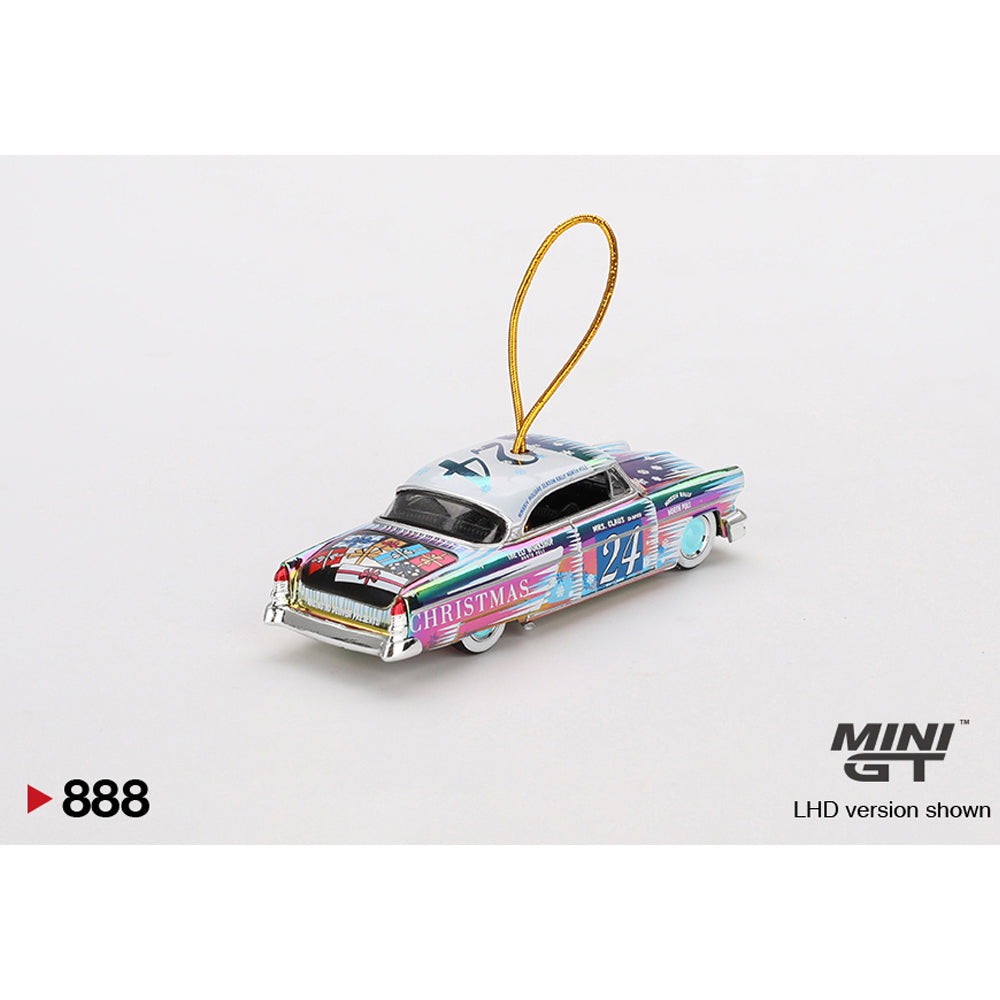 A unique set featuring the Lincoln Capri Christmas Hot Rod, with livery designed by contest winner, Tim Sadchikov, and the first-ever Mini GT Christmas ornament car.