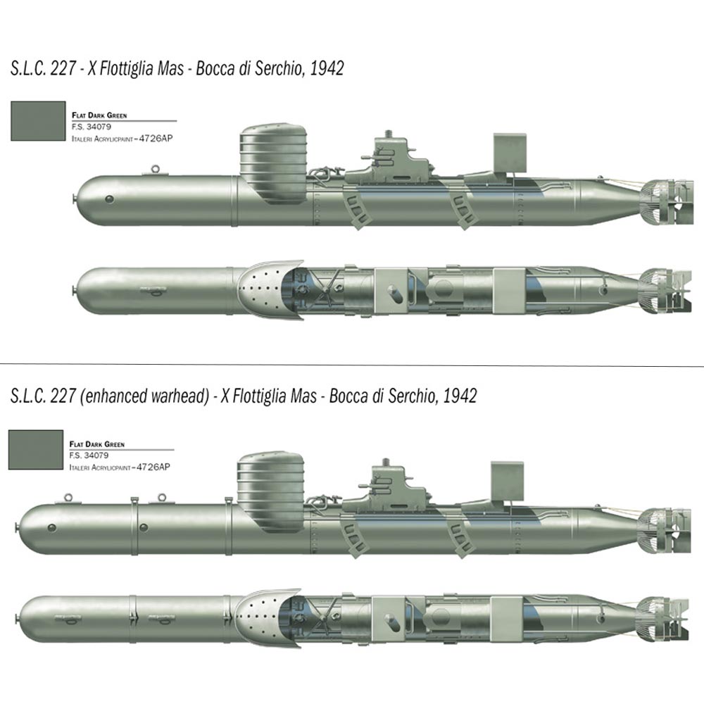 Based upon the experiences and successes of the Italian Regia Marina in the First World War. In 1935 Teseo Tesei and Elios Toschi developed and perfected the Siluro a Lenta Corsa (S.L.C.), which was more informally known as "Maiale” (Pig). This was a torpedo modified to allow it to be guided underwater by two operators equipped with respirators. It was intended to carry a high explosive warhead under the keel of enemy ships. The modified torpedoes had limited speed, were fitted with a guidance system and held batteries that powered the electric motor which guaranteed a range of 12-15 miles. The most notable action of these Italian Navy raiders took place on 19th December 1941. Transported by the submarine "Scirè" to the strongly defended Alexandria harbour, the S.L.C.’s were able to attack and disable for several months, Royal Navy battleships H.M.S: Valiant and the H.M.S. Queen Elizabeth.