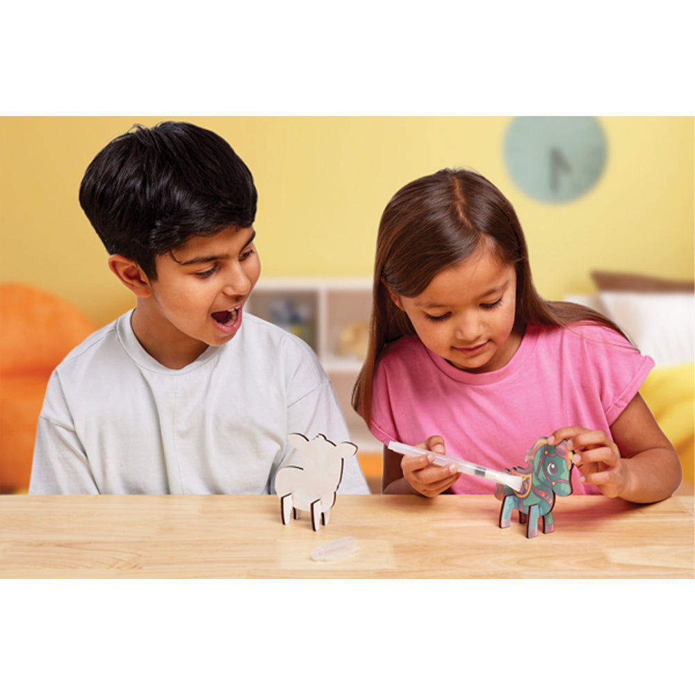 Construct your own cute 3D models with an added wow factor. Build the sustainably sourced wood model then paint with water using the refillable water brush provided. Sit back and watch the colourful design magically appear. Let it dry and paint again and again. Keep painting with water to reveal the designs to amaze friends and family. A simple way to keep children entertained on long journeys. There are six initial designs available to collect, create and colour.
