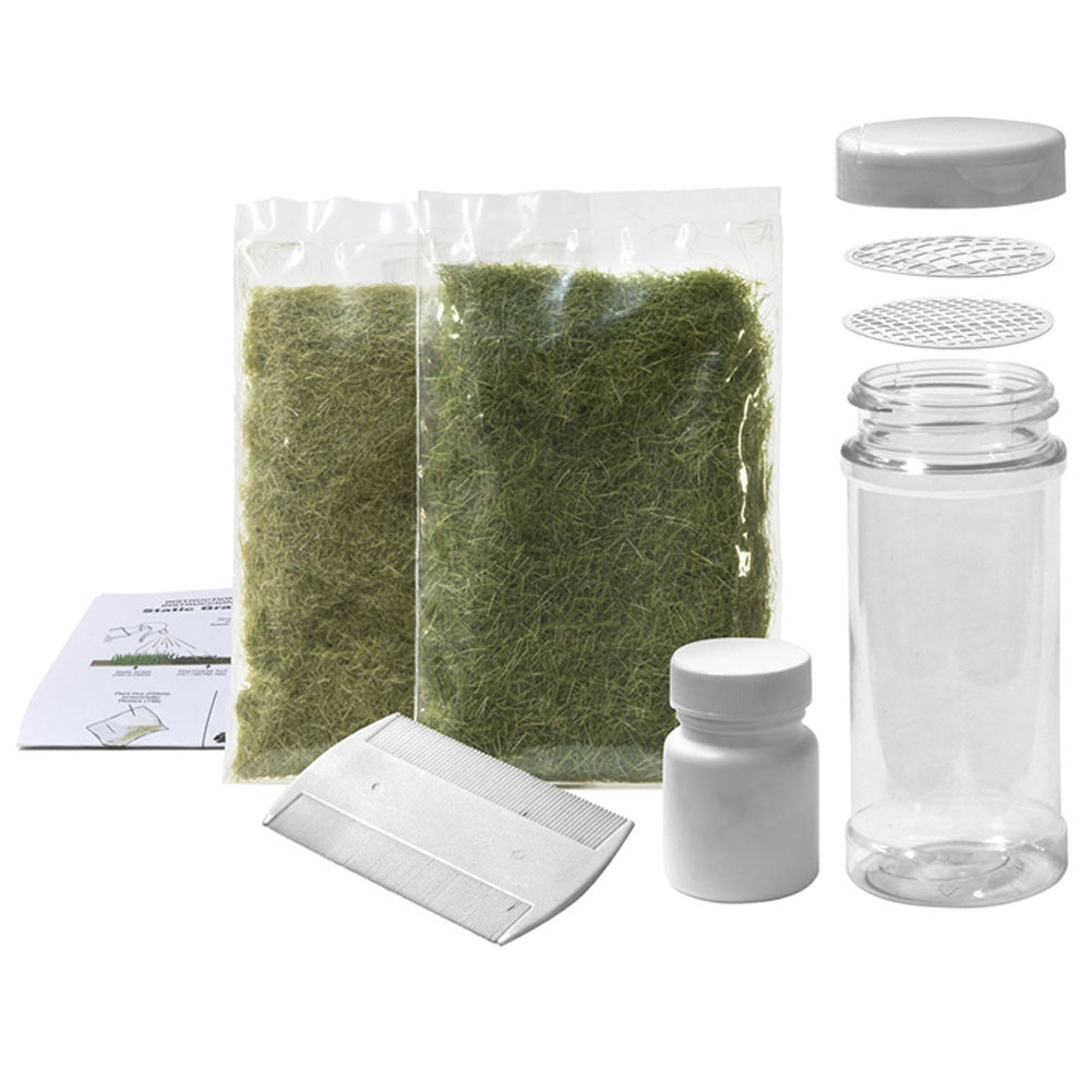 1 kit (Contents): Shaker Applicator - 8 oz (236 mL), Shaker Applicator Lid, Small Sieve, Large Sieve, Thatch Comb, 7 mm Light Green Static Grass - 17 g (0.59 oz), 4 mm Medium Green Static, Grass - 18 g (0.63 oz), Game-Tac™ - 1 oz (29.5 mL), Inst