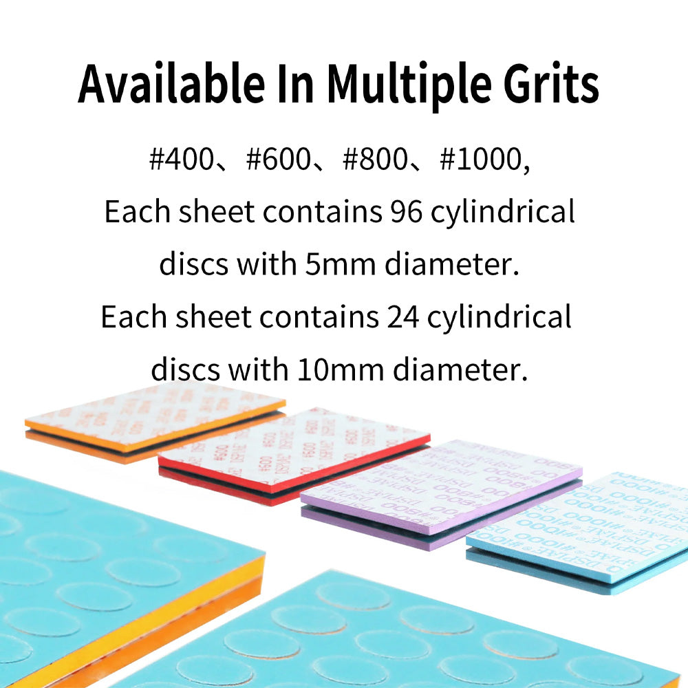 96 Discs (5mm diameter) per Sheet for each grit (400,600,800,1000).