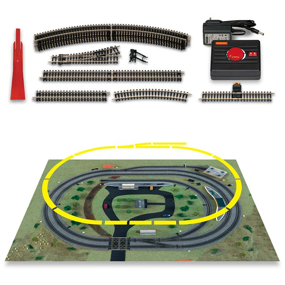 1x Locomotive Diesel, 1x Tank Wagon, 1x Ore Wagon, 1x Box Van, 1x Transformer (220-240v), 1x Train Controller (12v DC), 2x Straight Track, 8x Double Curve Track, 1x Power Track. 2x Double Straight Track, 1x Left-Hand Point, 1x Standard Curve Track, 1x Buffer Stop, 1x TrakMat & 1x Hornby 'Re-railer'