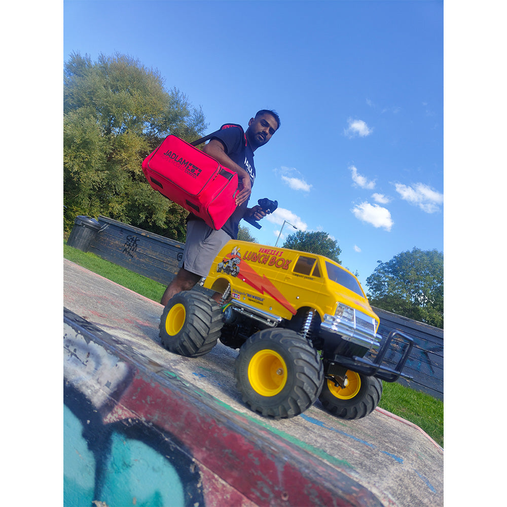 - The secondary compartment pocket to the side of the bag is emblazoned with our logo as well as Tamiya's, with kind permission. This spacious pocket is ideal for storing chargers, batteries, tools and everything else you'll need for your session!