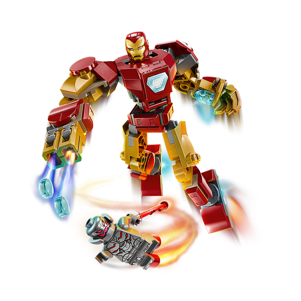 - Buildable Iron Man mech – The posable figure has movable arms, legs and fingers and the torso opens to reveal a cockpit that can hold the Iron Man minifigure