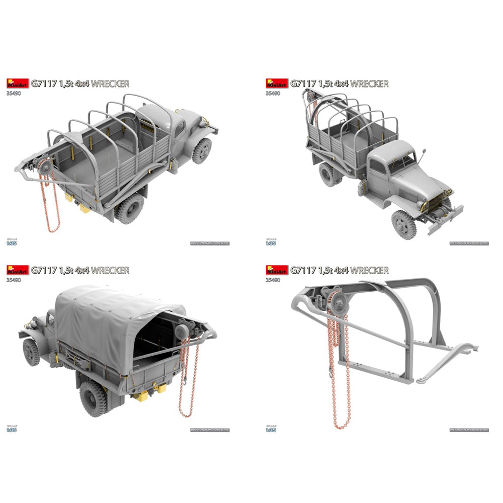 This detailed 1:35 scale plastic model kit recreates the G7117 1.5t 4x4 Wrecker vehicle. The kit includes injection-molded plastic parts, photo-etched components, and clear plastic parts for added realism. The kit accurately captures the design of this WWII-era recovery vehicle, offering modelers multiple display possibilities.