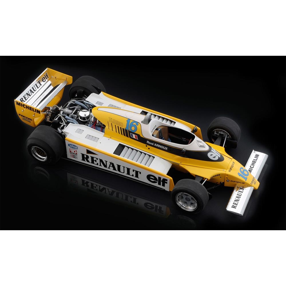 In 1977 the French car manufacturer Renault made its debut in the Formula 1 world championship with a team of its own that introduced important innovations in the racing world. He took part in the world championship in the 1980 season with the Renault RE20 equipped with a turbocharged V6 Renault Gordini EF1 engine capable of delivering 520 Horses. The team was completely French like the team of pilots composed by Jean-Pierre Jabouille, with the number 15 and René Arnoux with the number 16. During the season the team obtained three victories in the grand prizes in Brazil, South Africa and Austria. The Renault 20 series was modified and improved by also taking part in the first five races of the 1981 season when it was replaced by the 30 series with a redesigned chassis. The kit offers the possibility to realize the RE20 version of Arnoux in the GP in South Africa.