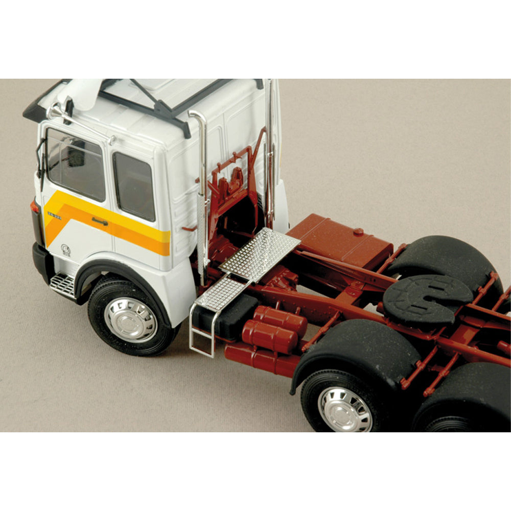 MAN is one of the most famous and well-known manufacturers of heavy industrial and commercial vehicles in Europe. Throughout its long industrial history it has introduced many technological innovations which have become benchmarks within the heavy transport vehicle sector. The MAN 26.321 was fitted with the 6-cylinder “Formula 6” diesel engine which, at the time, was a forerunner of the adoption of advanced technology capable of optimizing power and minimizing consumption. Even the cab design was studied and developed in order to satisfy the requirements of modern truck drivers who were becoming more aware and attentive to on-board comfort and vehicle ease of use. Equally, design changes also incorporated aesthetic features such as large horns, aerodynamic appendages and the characteristic spoiler on the roof of the cab. In this version the frame was strengthened to allow the adoption and fitting of four rear wheels.