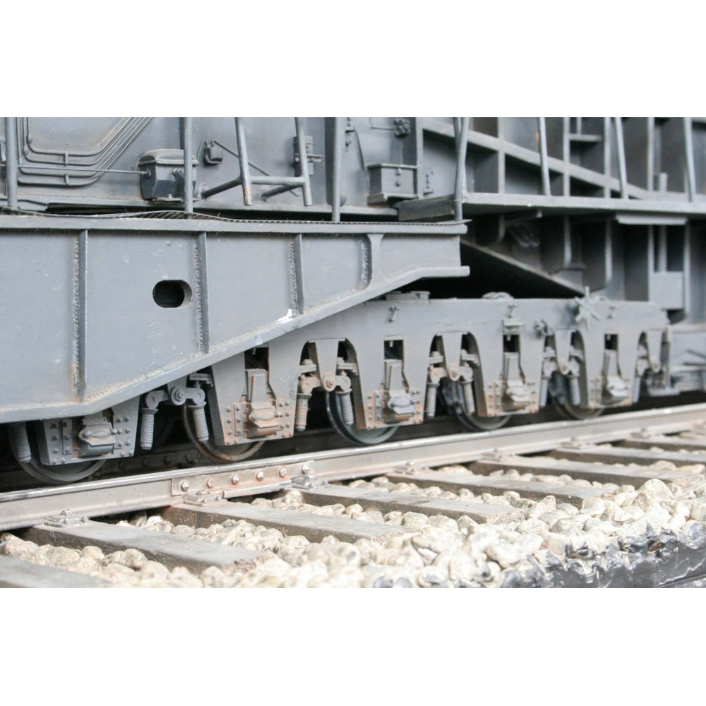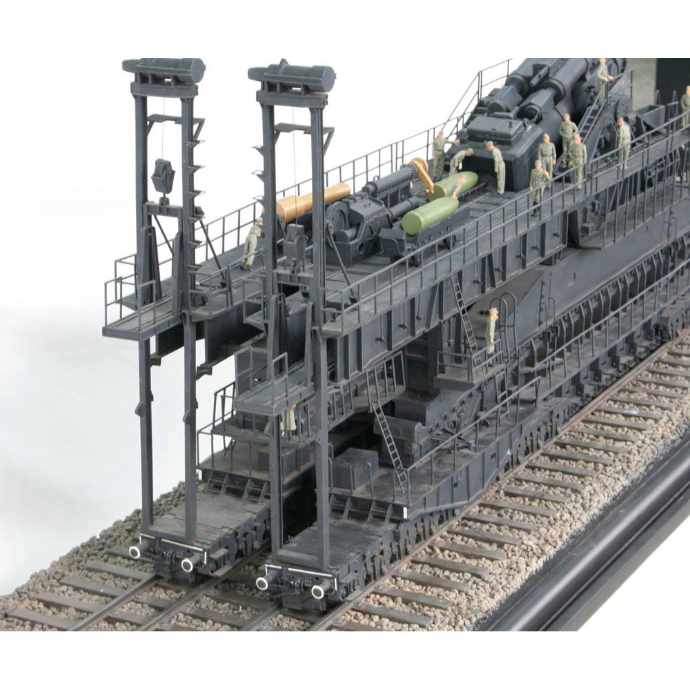 German 80cm K (E) railgun built in 1941 by Krupp and named 'Dora' after the wife of the chief engineer. The gun was required to 'pierce a metre or steel, 7 metres of concrete, or 30 metres of dense earth' and was so enormous two parallel railway tracks were necessary to ensure stability and weight distribution. Gun weight 1344 tonnes, barrel weight 400 tonnes, shell weight 7100kg. Range 40km, max elevation 53°, overall length 43m. Metal Troops Creation kit manufactured by Soar Art Workshop.