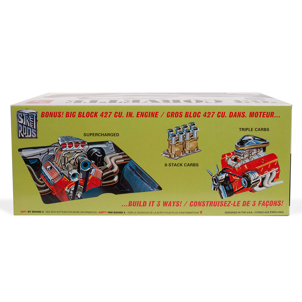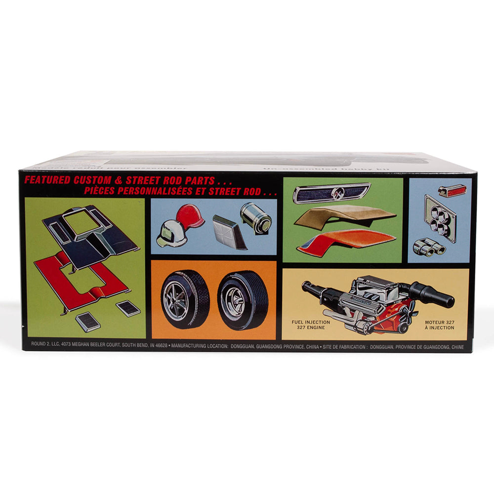 FEATURE PACKED: The 1963 Chevy Corvette Convertible kit includes stock, street rod, and custom options featuring fuel injection 327 engine, big block 427 cu in engine, 8-stack carbs, triple carbs, supercharger, hardtop, soft top, custom grille, 3 hoods, parachute, custom taillights, 2 helmets, 2 wheel options, and pad-printed vinyl tires. The kit also includes ALL NEW decals and vintage style Retro Deluxe™ AMT packaging.