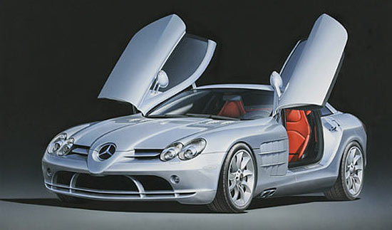 Formula One-derived auto constructor McLaren Cars cooperated with DaimlerChrysler to produce the Mercedes-Benz SLR, which debuted at the 2003 Frankfurt Motor Show. The long nose/short deck body is built of carbon composite material, and a powered by an AMG tuned 5.5L V8 screw-type supercharger engine, located in front position for optimum weight balance. Monstrous power output of 466.8 kw at BSOOrpm (626 hp) and 79.6kgm torque at 3250 - 5000 rpm is handled by a 5-speed automatic transmission. The car Is capable of amazingly fast acceleration and super-quick braking thanks to its massive carbon ceramic brake discs and pop-up rear spoiler. The name SLR (Sports Light Racing) was originally used on the 1955 sports radng car 300 SLR, and made a comeback with this Benz-McLaren machine.