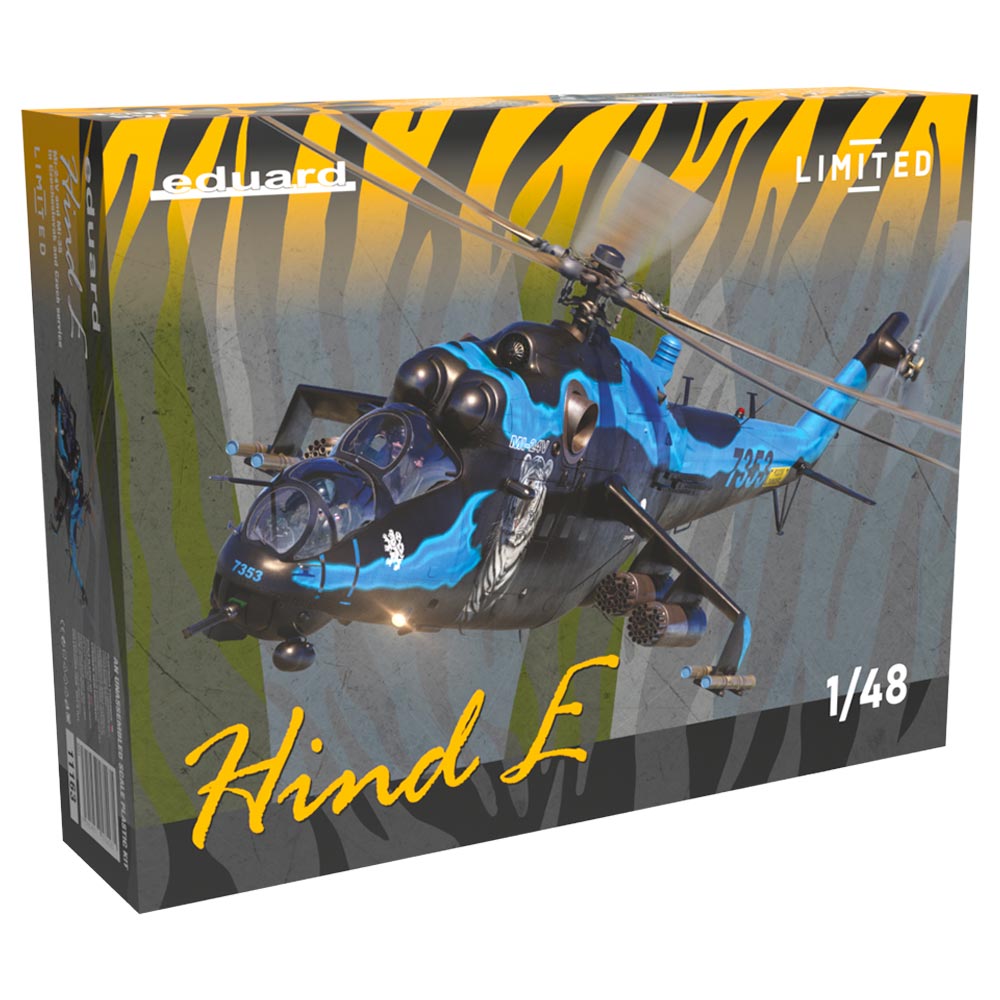 Mil HIND E 1/48 Limited edition kit of Soviet attack helicopter Mil Mi-24V and Mi-35 in 1/48 scale. Focused on aircraft used by Czechoslovak and Czech Air Forces. - plastic parts: Zvezda - marking options: 8 - decals: Eduard - PE parts: yes, pre-painted - painting