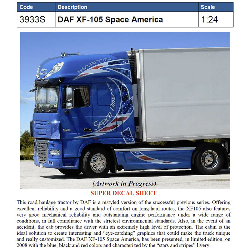 This road haulage tractor by DAF is a restyled version of the successful previous series. Offering excellent reliability and a good standard of comfort on long-haul routes, the XF105 also features very good mechanical reliability and outstanding engine performance under a wide range of conditions, in full compliance with the strictest environmental standards. Also, in the event of an accident, the cab provides the driver with an extremely high level of protection. The cabin is the ideal solution to create interesting and 'eye-catching' graphics that could make the truck unique and really customized. The DAF XF-105 Space America, has been presented, in limited edition, on 2008 with the blue, black and red colors and characterized by the “stars and stripes” livery.