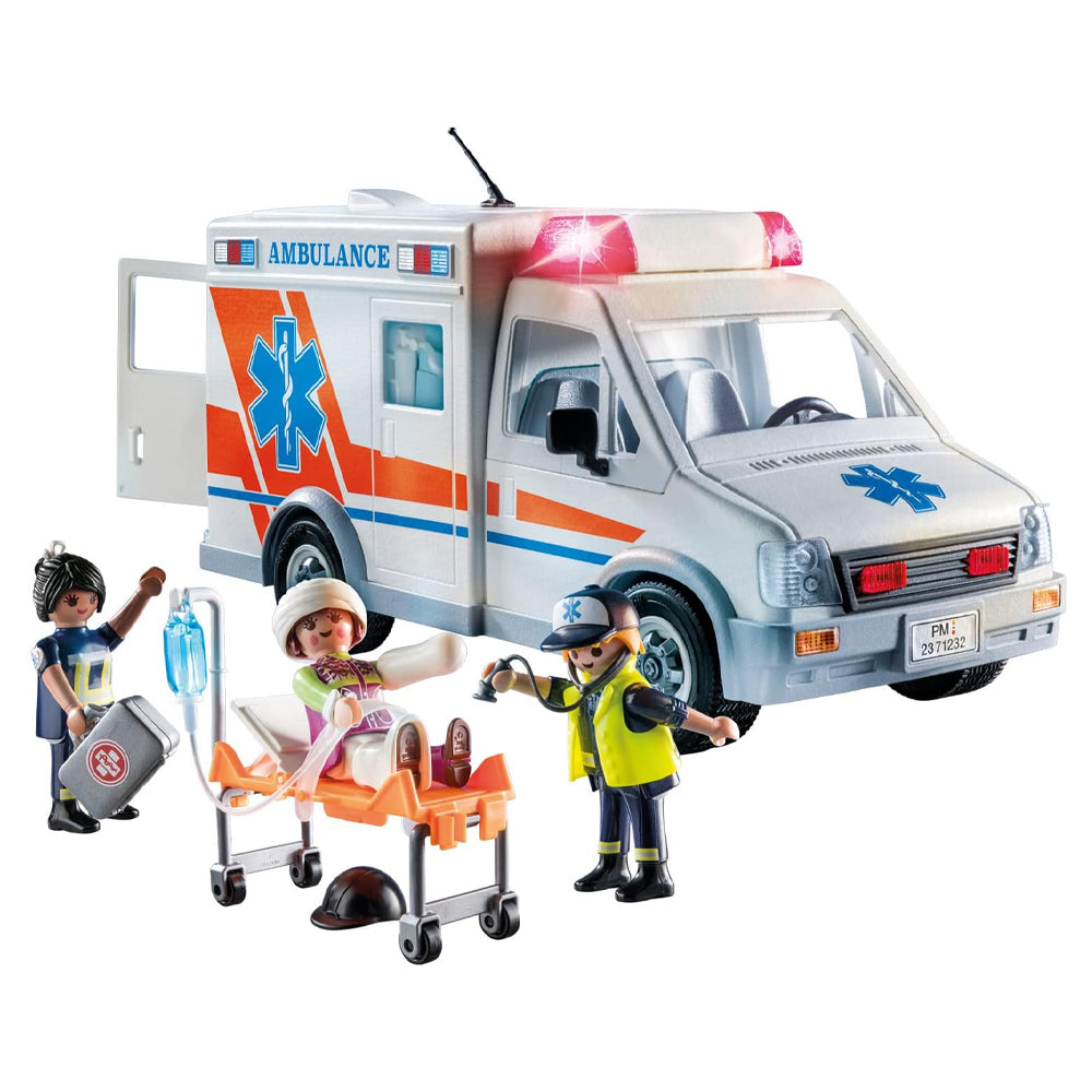 Includes 3 PLAYMOBIL figures: a female and a male paramedic and a woman. a stretcher, infusion stand, oxygen apparatus, operating instruments, stethoscope, plasters, head bandage and a first-aid kit