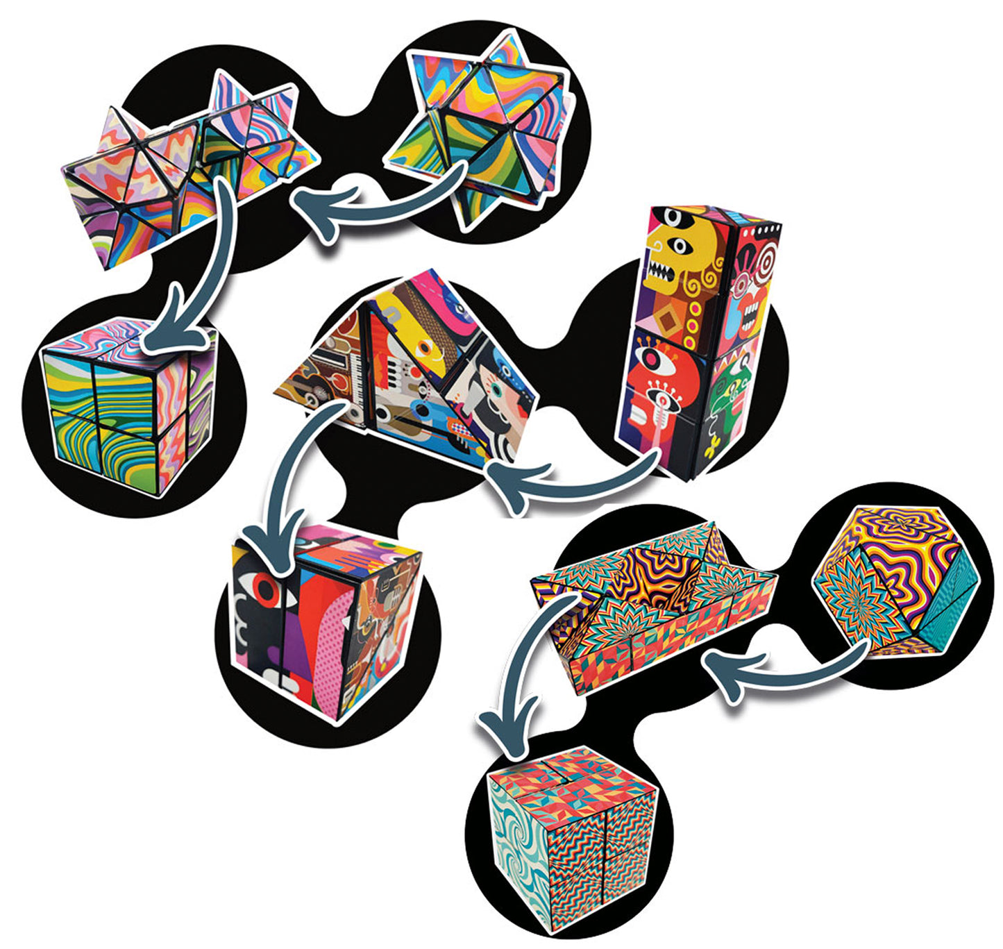 Shape shifting Magic Cube, Star and Hexagon. Let your imagination run wild and enjoy the HUUUGE range of formations you can create from these shapes. Twist, solve, flip, repeat! This mesmerizing design will almost make you believe in magic! Three assorted designs.