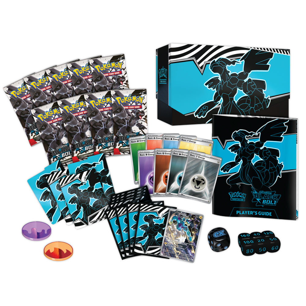 - Furthermore, this box contains 45 Pokémon TCG Energy cards, 6 damage-counter dice, 1 competition-legal coin-flip die, 2 plastic condition markers, and a player’s guide to the Scarlet & Violet—Black Bolt expansion.