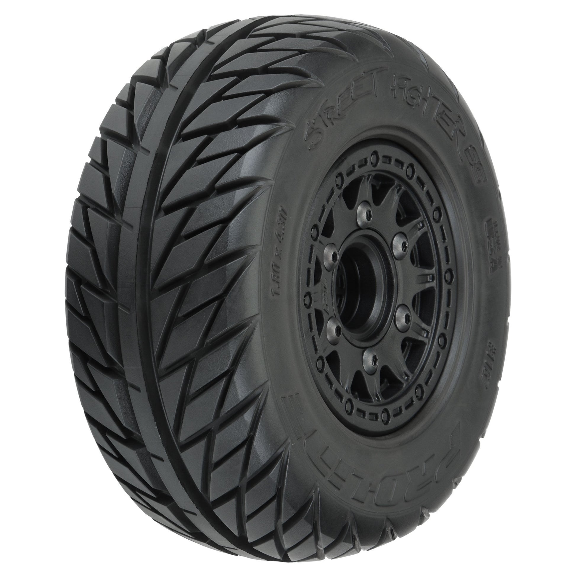 This is a pair of pre-mounted Pro-Line Street Fighter SC Tires. Looking for the ultimate long-wear street tire? Then check out Pro-Line's Street Fighter SC. Based on the latest in high-performance on-road tire technology, the Street Fighter SC has the perfect balance of G force enhancement and style that will keep your truck turning heads.