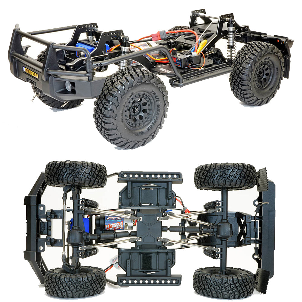 Underneath the Trooper a CNC machined LCG chassis holds a compact single speed gearbox and split transmission mounted as low as possible. Reverse transmission helps counter torque twist effect. A 3-link with Panhard bar set-up is featured at the front with traditional 4-link rear all controlled by aluminium oil filled shock absorbers. Straight axles front and rear house spiral cut drive and pinion gears, with the front using heavy-duty universal driveshafts.