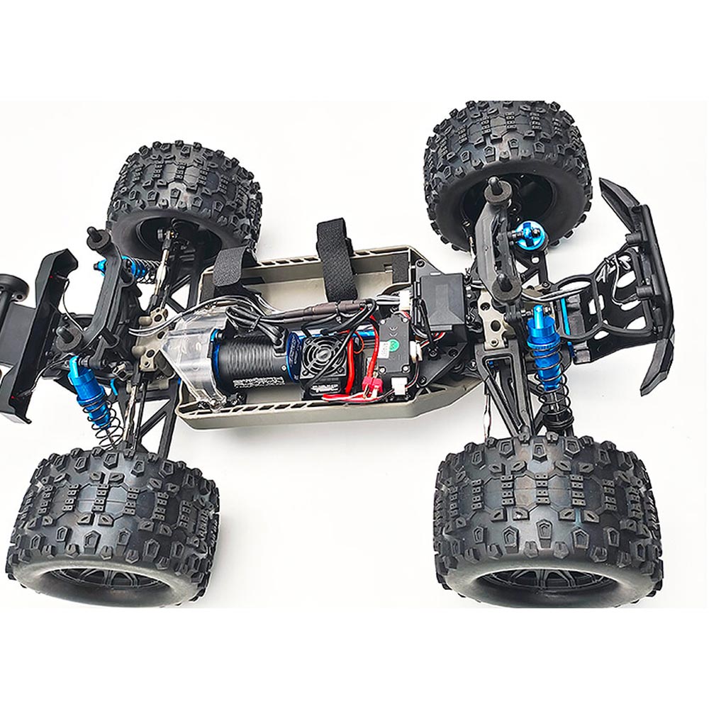 Powered by a Hobbywing 50A brushless speed control and 2500kv motor, coupled with the included Voltz 3S 3500mAh Lipo battery the RamRaider can reach impressive top speeds for its size, while still being very drivable on most surfaces. The rear mounted wheelie bar works to provide a sta-ble footing for those heavy accelerations when you light up the rear tyres.