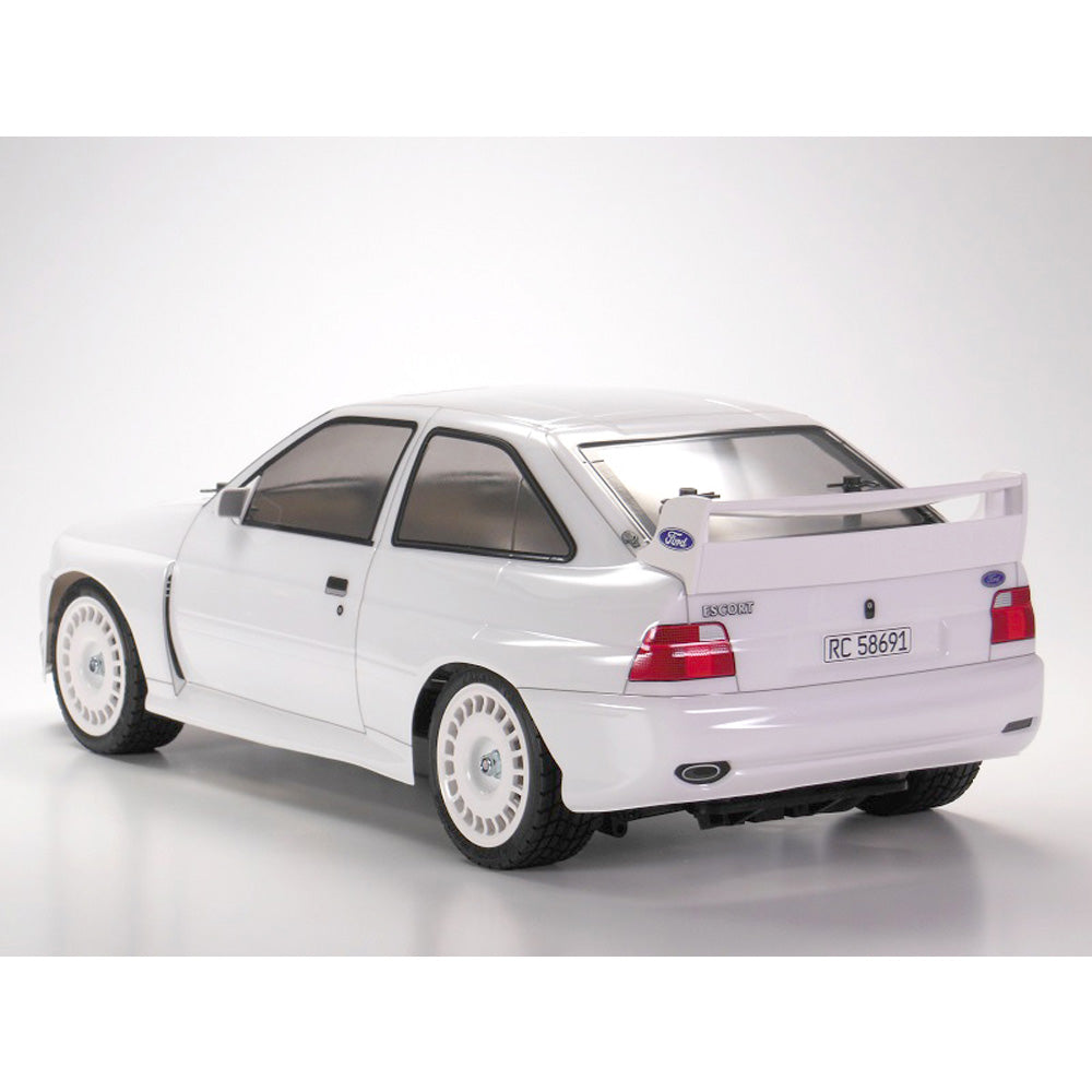 This R/C model assembly kit recreates a 3-door hatchback Ford Escort Mk.6 with customizations such as blister fenders, front spoiler and rear wing. The powerful form is captured by a polycarbonate body which is based on the efficient shaft-driven 4WD of the TT-02 chassis.