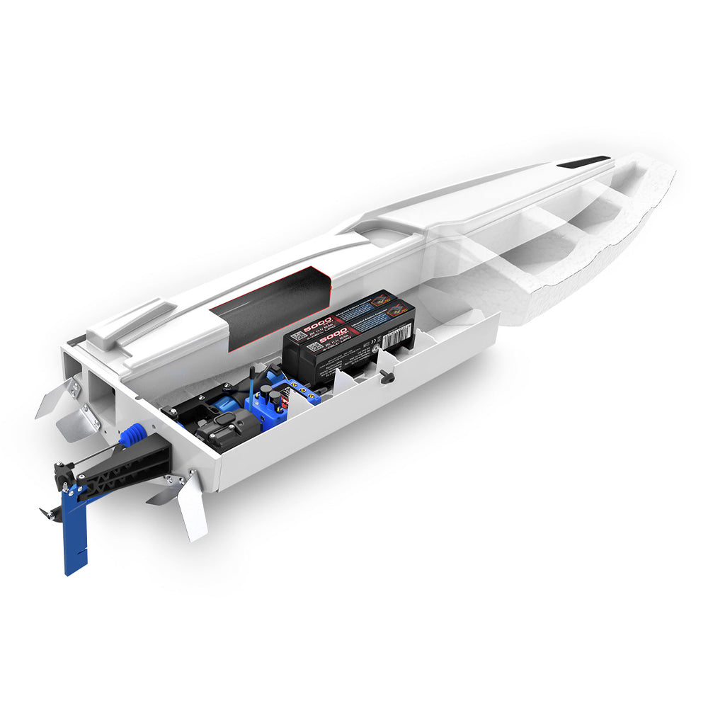Grab a fistful of throttle and Spartan SR’s VXL-6s™ Marine power system transforms 22+ volts of LiPo power into furious acceleration. The high-performance prop digs in, getting the boat on plane quickly and efficiently as it slices through the water at speeds of 50 mph and beyond.