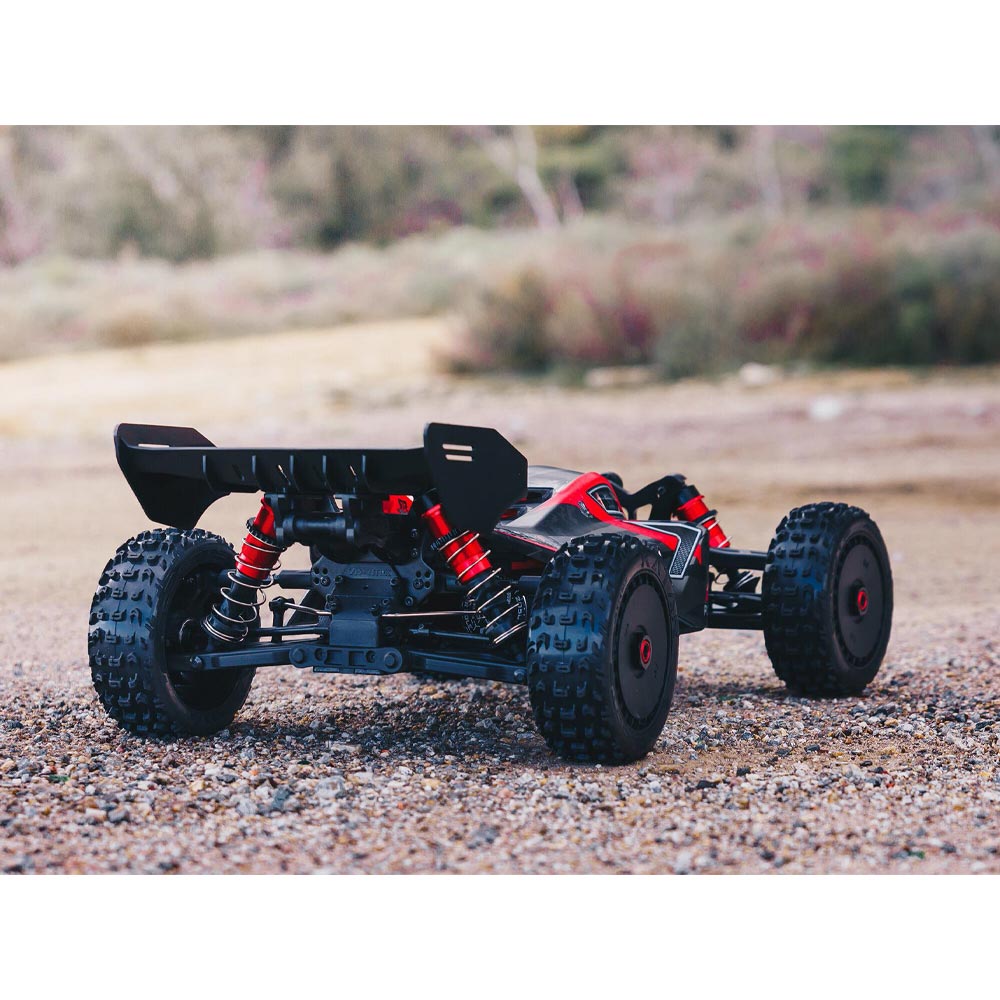 The low-drag buggy wheels, now with +1mm hexes, arrive outfitted with super-aggressive, multi-surface dBoots® KATAR™ tires. A low-drag wing helps keep the vehicle grounded. Both contribute to confident control and responsive handling at thrilling high speeds. Topping it all off is a sleek buggy body with streamlined good looks, featuring a matte black and red paint scheme with forged composite detail.