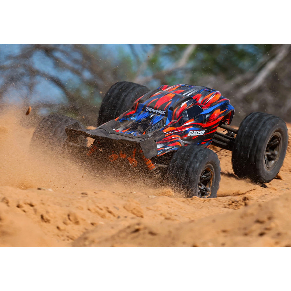 Engineered. Tested. Built to a higher standard. The all-new Sledge® is made to exceed your expectations for quality, toughness, and fun. The rock-solid chassis, massive steel drivetrain, ferocious 6s power, and race-inspired handling leave everything else in the dust. New belted Sledgehammer® tires limit high-speed tire expansion for a larger, flatter contact patch and game-changing high-speed precision and control.