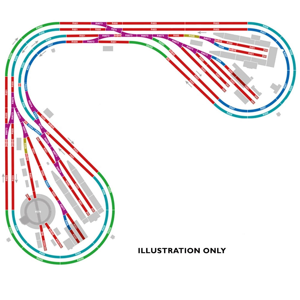 Note: The illustration image of the layout shows a representation of where you might place station & platform accessories with this model railway layout. You are of course free to place your layout however you wish. Please note that the grey areas (except turntable) denoting station platform accessories are not included in this pack and need to be purchased separately.