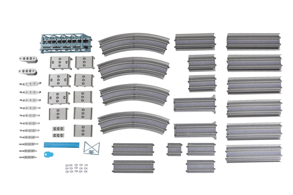 The next stage in realistic snap track - Superelevation is the term used to describe track in which one rail is higher than the other, much like a banked curve on a freeway offramp or a high speed corner in NASCAR, these banked curves are specially designed to reduce wheel wear and increase both comfort and safety in all manner of trains, fast or slow, passenger and freight. These superelevated curves are a standard installation in modern railroads, and before now they were complicated and finicky to replicate at model railroad scale level, but no longer! Kato UNITRACK makes it simple with modular easement and superelevated curves, available with modern pre-cast concrete ties (which not only modernize the look of your rails, but help differentiate the pieces at a glance from non-banked track pieces).