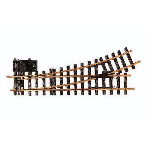 Straight track: 440 mm / 17-5/16". Branch: left, R3, 22.5deg. The switch mechanism (LGB 12010) can be installed on the right or the left side of the switch. The LGB control box (LGB 51755) or its equivalent is ideal for controlling this turnout.