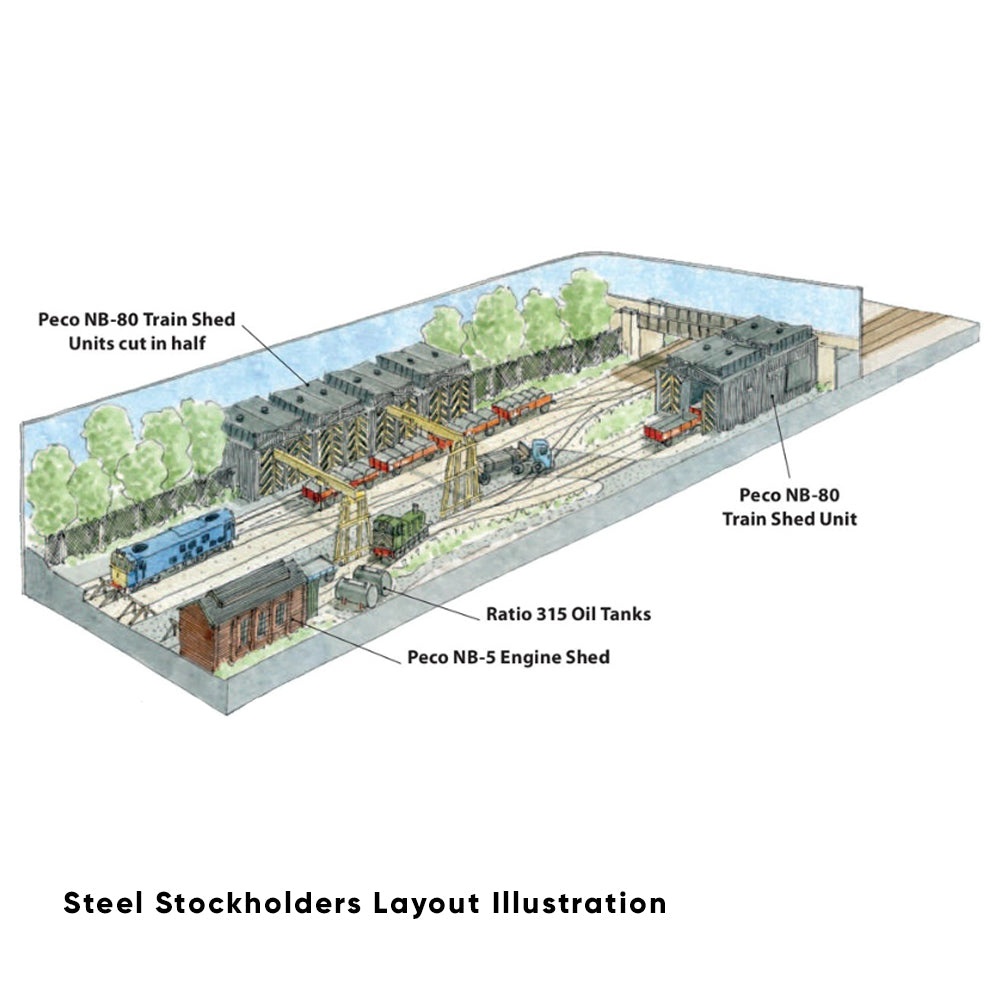 "A minimum space yard that could be interpreted for almost any rail-bourne industry. This particular fictitious version has been inspired by the arrangement that once existed at Brian Donkin Engineering/Chesterfield Cylinders, Derbyshire, and three Peco NB-80 'Manyways' Train Shed Unit kits, one straight out of the box, and a further two cut in half to create a low-relief backscene. There are also two fixed overhead cranes using upper sections of a pair of Ratio 242 Steel Trestles and two sections of Plastruct 'I' girder, providing a lift facility for rail/road or rail into the warehouses. Note the NB-80 kit has doors approximately 37mm high, but will be mounted on a loading platform further increasing height. Steel trestles, with 'I' girder on top will need to be at a height so the girder goes in through the top of the doorway at the centre joint of a pair of doors, with doors cut to fit."