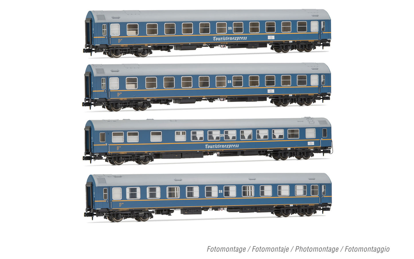 Arnold HN4420 DR, 4-unit pack OSShD type B coaches "Touristen-Express", set 1 of 2, blue livery, ep. III, 2 x WLAB + 1 x WR + 1 x Salon N Gauge