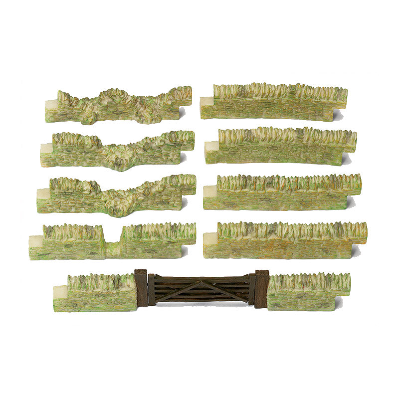 Part of the Hornby Skaledale range, this resin wall pack contains typical Pennine stone walling sections of two curved walls, three broken walls, two straight walls, one stile section, two gate pillars and a five-bar gate.