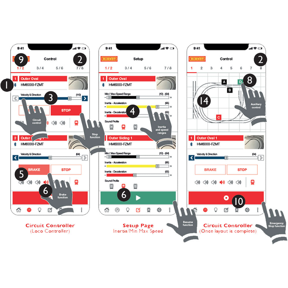 (See image 3)Locomotive Control - Each HM6000 unit has the capabilities of powering up to two circuits, however a total of 4 units (9) (1/2, 3/4, 5/6 etc. 1/2 being one HM6000) may be added to a layout, which will allow for a total of 8 circuits (2). This in turn provides the selected control via a handheld smart device of 8 locomotives controlled independently on their individual circuits. The direction, inertia, braking and Emergency Stop (10) controls are clearly marked on the App’s screen. Also, up to 12 accessories, be they points (11), lighting (12) or other auxiliary (13) items that require power can be operated via the App’s screen once they are connected to the HM6010 PAC.