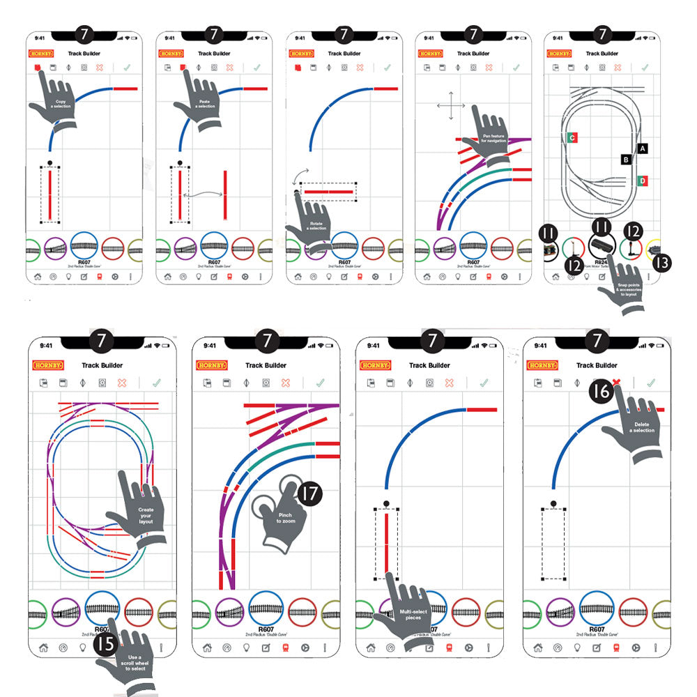 Should a track piece not be required it can be easily pulled away from the circuit and deposited into a ‘Bin’ function (16). Once the diagram has been completed the auxiliary operating components can be added and with the ability to ‘pinch and zoom’ (17) even the smallest of track pieces can be easily positioned.