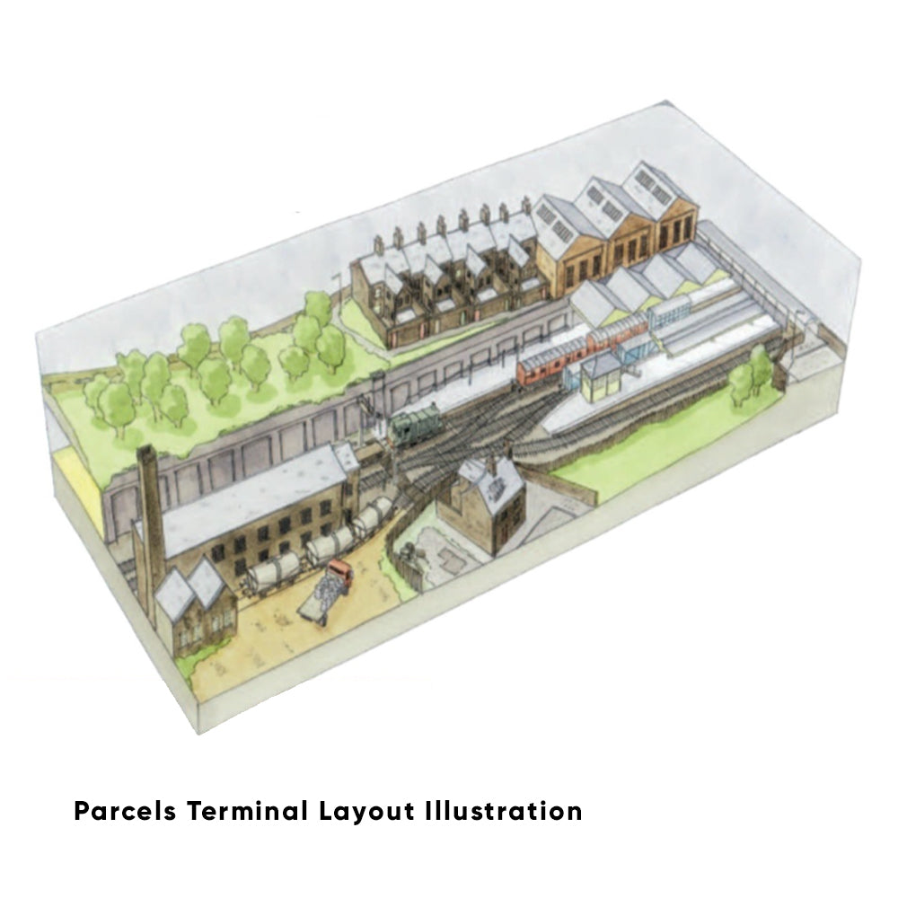 "The first of several minimum space layouts is this parcels terminal set in a station which has seen better days. The design has three platform faces with a crossover, a kick back siding into a milk depot and two hidden non- scenic tracks (behind the warehouse) also with a crossover for running round locos. We have envisaged the builder using either steam or diesel locos together with a selection of vans and non-passenger carrying stock. Scenically there should be an air of neglect contrasted by the busy parcel activity which could be accentuated by the use of night-time lighting, adding a further dimension to the layout. Although through passenger trains have ceased, a local DMU service continues to use the front bay platform."