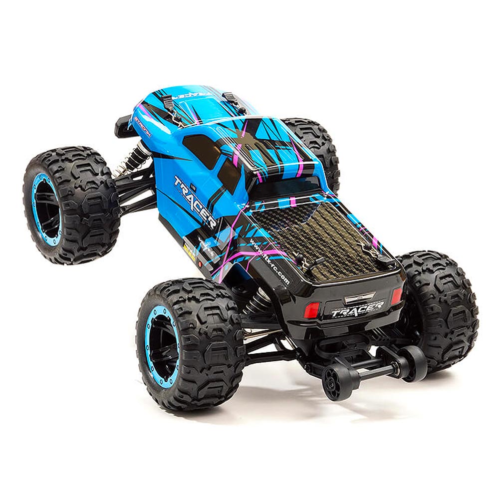 A new 100m range radio is provided to help control those longer speed runs and as with the brushed version, the Tracer brushless edition features coil sprung shock absorbers with multiple mounting points, double wishbone suspension and front universal driveshafts for smooth suspension movement while steering through the rough stuff. Shaft driven 4WD and with geared differentials front and rear provide traction in all conditions.