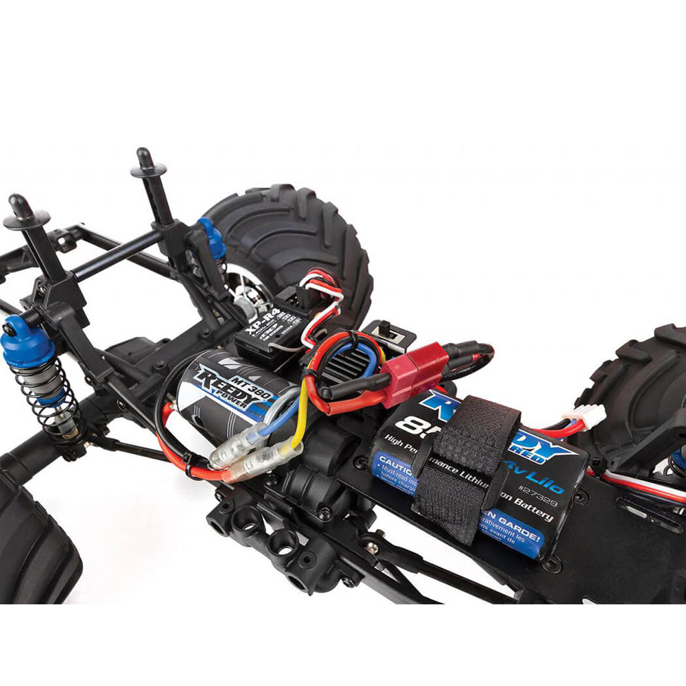 Designed not only for scale looks with realistic chrome wheels, chevron-style tires, and retro-styled van body, the MT12 is built for car-stomping action as well. The steel ladder frame chassis provides the perfect backbone for this rugged little monster. The 4-link suspension, threaded shocks, and soft rubber tires give the grip and performance needed to smash over cars or through dirt and mud. Transferring power to the ground is a compact 3-gear transmission, plastic low-friction slider-type drive shafts, front steel CVA axles, and metal-shield ball bearings.