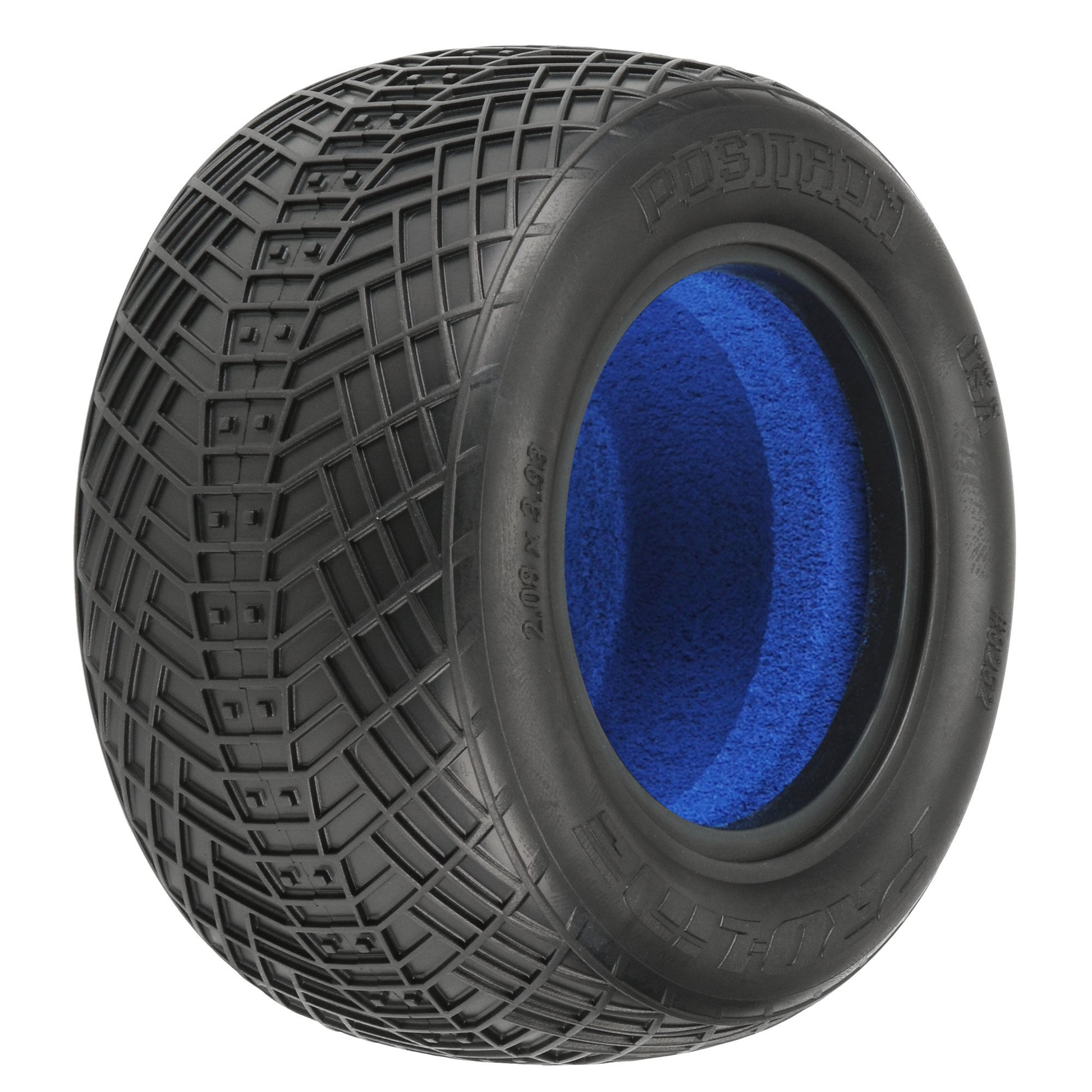 This is a pair of Positron Stadium Truck Tires. The future of Stadium Truck Tire Performance is here with Pro-Line's all-new Positron T Tire! Designed from the ground up with a futuristic directional tread design, the Positron delivers true next generation performance with improved grip and corner speed on indoor clay tracks. The tread design pays homage to the Electron and ION tire before it with the 2 center pins boxed in by connected bars for a familiar Pro-Line signature look. From there the connected bars shoot off at angles that have been specifically designed to provide maximum Forward Bite combined with unmatched corner speed all while lasting longer than the competition. The Positron is directional, which adds another tuning option for the racers always looking for that extra edge since it will perform differently depending on which direction it is run. Get the newest and best race tire for your Stadium Truck, the Pro-Line Positron!