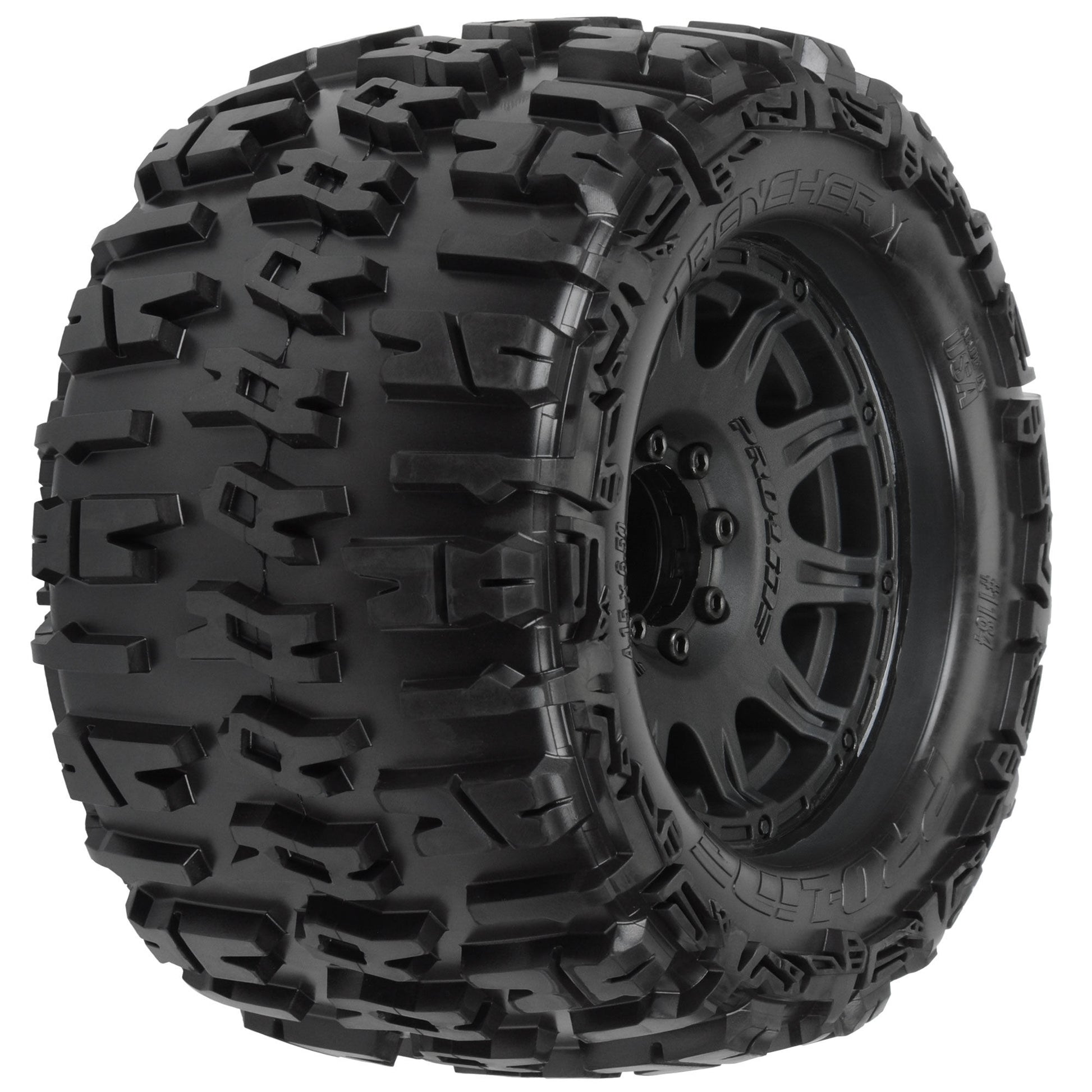 This is a pair of pre-mounted Trencher X 3.8" All Terrain Truck Tires. Leave a mark with your  Monster Truck  wherever you are with Pro-Line's Trencher X tires. The Trencher X tires are designed to give your MT optimal traction on just about any surface. Super cool horizontal H shaped treads give your MT ridiculous amounts of forward bite. With tread height at 1/4" tall, you'll find that durability and longevity are second to none.