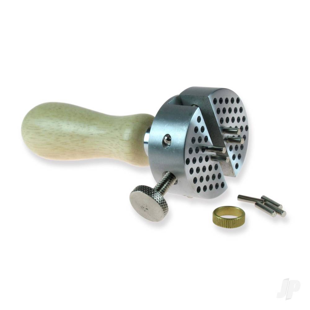 This really useful tool is ideal for holding small and odd-shaped parts for filing, painting, engraving, sawing, shaping etc. The four steel p-ins can be placed anywhere around the head and are also useful for bending and forming wire around. Handle can be removed and the head can then be locked in a bench vice. 140mm long
