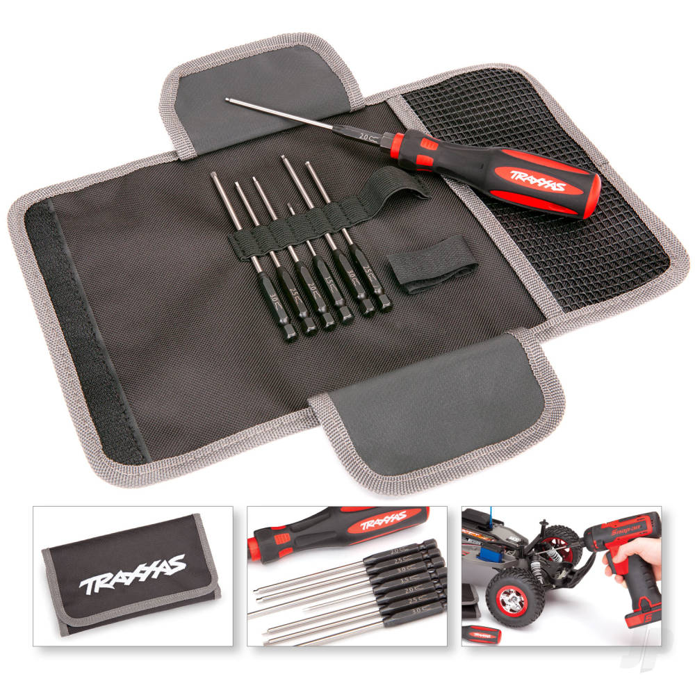 Maximum Durability Traxxas premium tool kits are manufactured from exceptionally high quality materials to provide years of pro-level service. The thoughtfully engineered grip features an overmoulded rubber design for more power and excellent comfort. The precision-ground, hardened-steel hex tips fit just right, to prevent wear, rounding, and screw damage. Designed specifically for Traxxas models, these speed bit sets come in a tough, compact pouch making them ideal to take along for service in the field.