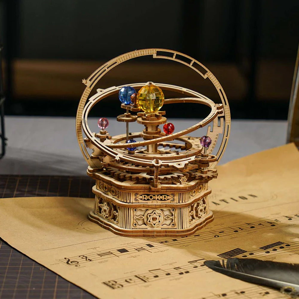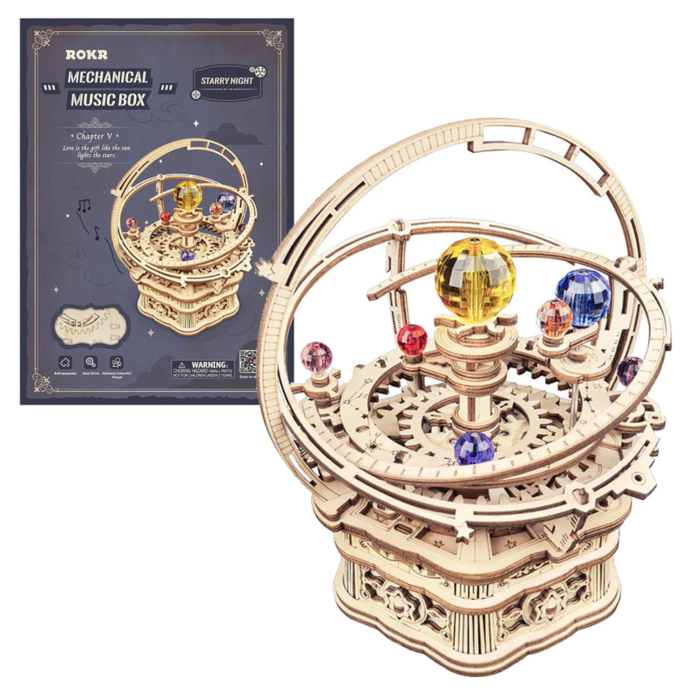 This DIY ROKR Starry Night Orrery mechanical music box AMK51 is a unique self-building music box 3d wooden puzzle toy. Best DIY gift for friends & kids. Fast delivery worldwide.