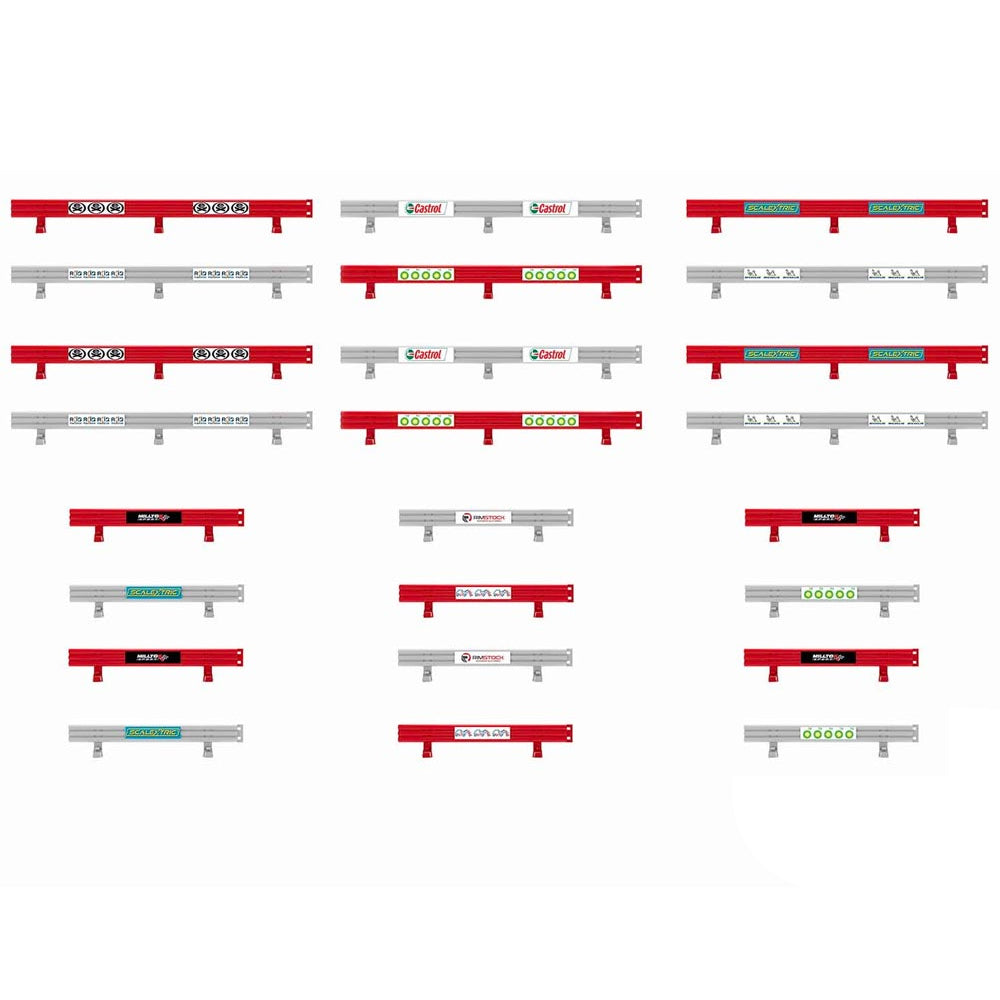 12x long and 12x short Scalextric Crash Barriers With Stickers. Decals: Castrol, Scalextric, Michelin, BP etc