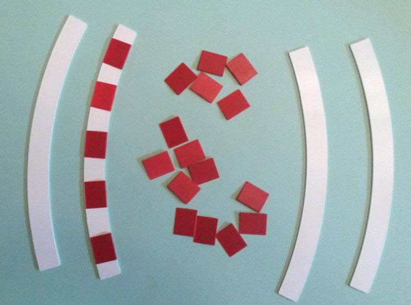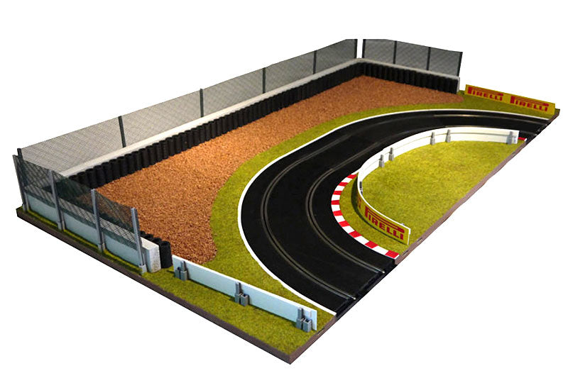 Motor racing circuits almost always define the inside of the corners with kerbs, usually with raised rumble strips to discourage the drivers from cutting the corners. Together with some on the straights just before and after corners they also usually define the 'racing line'. Now, if you are routing your own track from wood or are putting borders alongside your track pieces, you can reproduce these with our kerb packs. These are injection moulded in white and red plastic. The white shapes are stuck on round the inside of the bend and then the red rumble strips glued on to them at the intervals you wish. So no painting is required. This pack is suitable for Scalextric Radius 2 curves (C8206) but can also be used with other track systems or routed tracks for tight corners. It is enough for 180 degrees of Radius 2 corners, which is 4 Scalextric R2 45 degree curves.