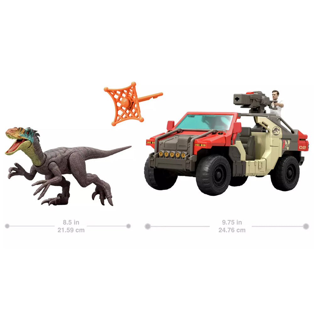 Realistic play! Designed at relative scale, the 3.75-inch tall Krebs,10.7-inch-long off road vehicle and 7.5-inch long Velociraptor are ready for realistic chase and battle play or display.