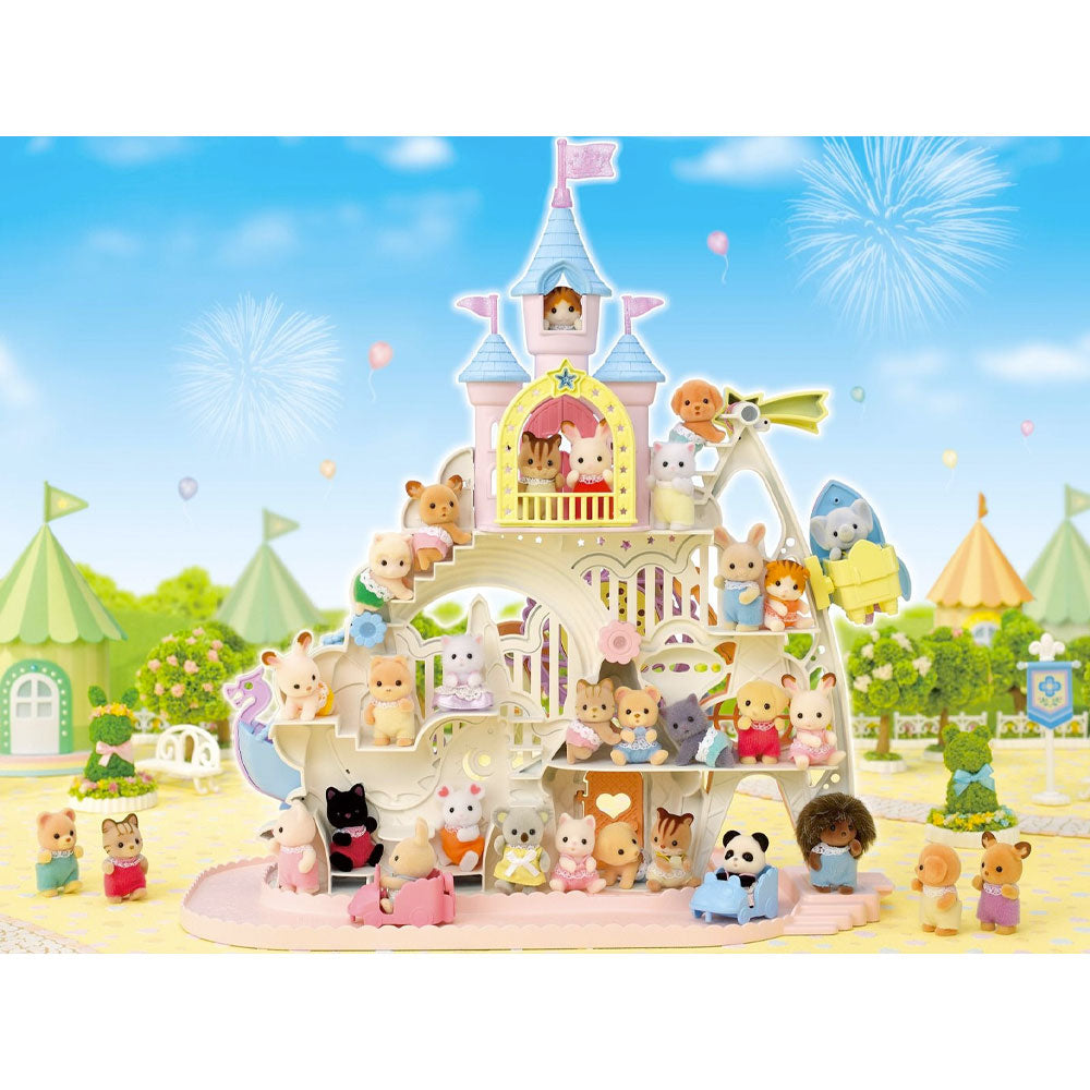 The Baby Amusement Park features an amazing castle and lots of rides. There's a Ferris wheel, Viking ship, go karts, and a rocket ride. Pookie Panda Baby (sitting), Milk Rabbit Baby (sitting), and Persian Cat Baby (sitting) are also included, so it can be played with on its own.